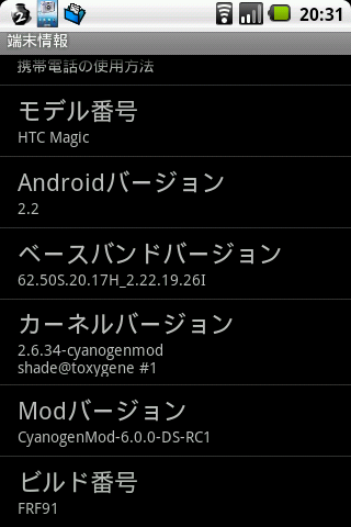 CyanogenMod 6.0を導入すると、端末情報が↓のようになります。
